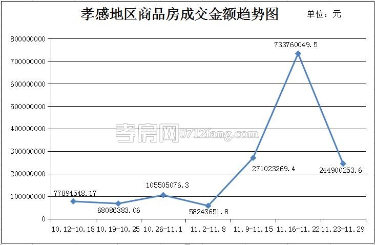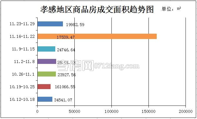 據(jù)孝房網(wǎng)數(shù)據(jù)研究顯示,從2015年11月23日到2015年11月29日,孝感地區(qū)銷售總交易記錄259套,面積為34541.07平方米,金額為244900253.6元,均價為7090.12元/平方米。
