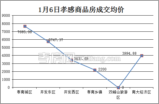 1月6日,全市的成交均價(jià)為5214.50元/㎡。其中孝南城區(qū)為7685.06元/㎡,開發(fā)西區(qū)為5747.37元/㎡,開發(fā)西區(qū)為3431.69元/㎡,孝南鄉(xiāng)鎮(zhèn)2200.00元/㎡,南大經(jīng)濟(jì)區(qū)為3994.88元/㎡。