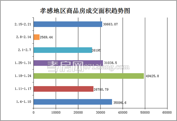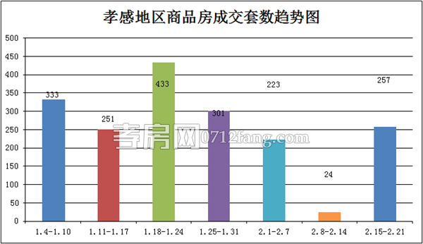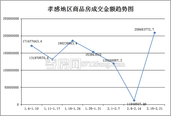 據(jù)孝房網(wǎng)數(shù)據(jù)研究統(tǒng)計(jì),從2016年2月15日到2016年2月21日,孝感地區(qū)銷售總交易記錄257套,面積為30663.07平方米,金額為209663772.71元,均價(jià)為6837.66元/平方米。