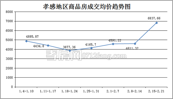 從2016年2月15日到2016年2月21日,孝感地區(qū)銷售總交易記錄257套,環(huán)比比上上周(24套)上漲約91%;成交均價(jià)6837.66元/平方米,與上上周(4611.32元/平方米)上漲約33%;成交面積30663.07平方米,環(huán)比上上周(2569.44平方米)上漲約92%;成交總金額環(huán)比上上周上漲約94%。