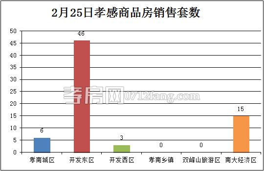 2月25日,全市的銷售套數(shù)為70套,其中孝南城區(qū)為6套,開(kāi)發(fā)東區(qū)為46套,開(kāi)發(fā)西區(qū)為3套,南大經(jīng)濟(jì)區(qū)為15套。