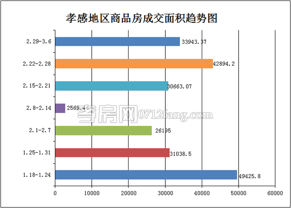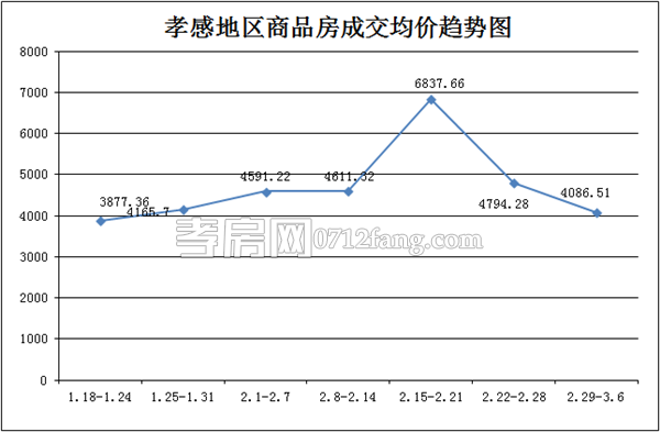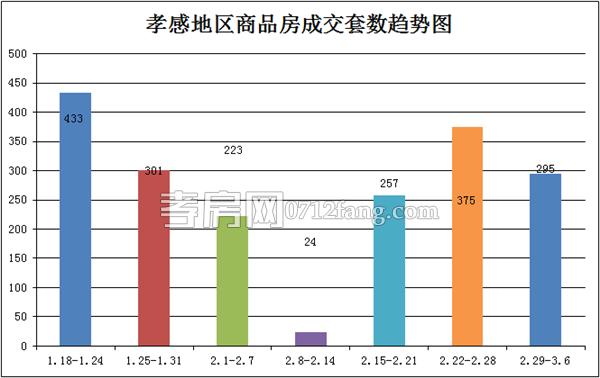 從2016年2月29日到2016年3月6日,孝感地區(qū)銷售總交易記錄295套,環(huán)比比上上周(375套)下降約21%;成交均價4086.51元/平方米,與上上周(4794.28元/平方米)下降約15%;成交面積33943.37平方米,環(huán)比上上周(42894.20平方米)下降約21%;成交總金額環(huán)比上上周下降約33%。
