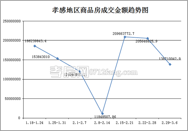 據(jù)孝房網(wǎng)數(shù)據(jù)研究統(tǒng)計,從2016年2月29日到2016年3月6日,孝感地區(qū)銷售總交易記錄295套,面積為33943.37平方米,金額為138710042.93元,均價為4086.51元/平方米。