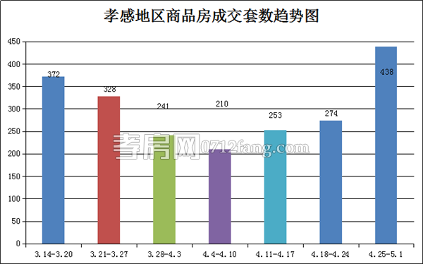 分析:上周孝感樓市新房成交量再在近五個月中再一次突破創(chuàng)新高,,上周成交438套,從上圖可以看出,自三月中旬成交量下滑了近四周后開始上升,經(jīng)過三周的漲幅,上周成交量大幅上漲。上周正值五一黃金周,看來節(jié)點購房還是很多購房者所意向的。下周五一節(jié)點余溫,成交量是否有影響呢?那么下周新房成交量是漲是跌?是否會有所回升?下周為您揭秘,孝房網(wǎng)用數(shù)據(jù)解讀樓市,感謝您的持續(xù)關(guān)注。