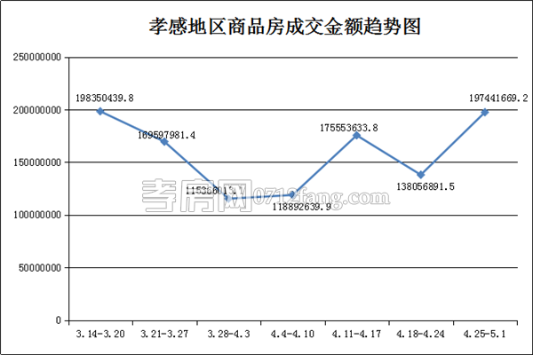 據(jù)孝房網(wǎng)數(shù)據(jù)研究統(tǒng)計,從2016年4月25日到2016年5月1日,孝感地區(qū)銷售總交易記錄438套,面積為50039.24平方米,金額為197441669.21元,均價為3945.74元/平方米。