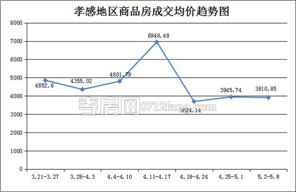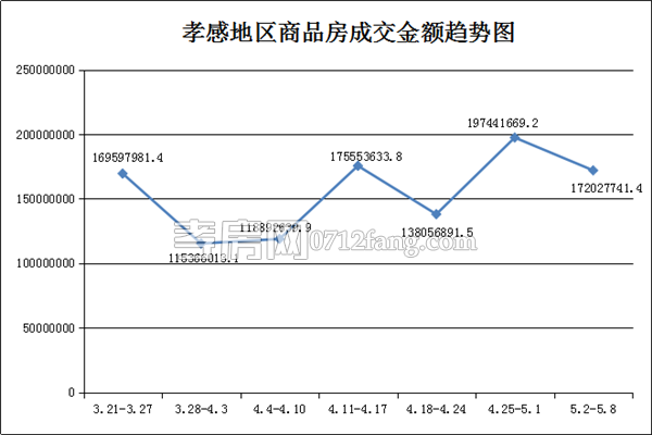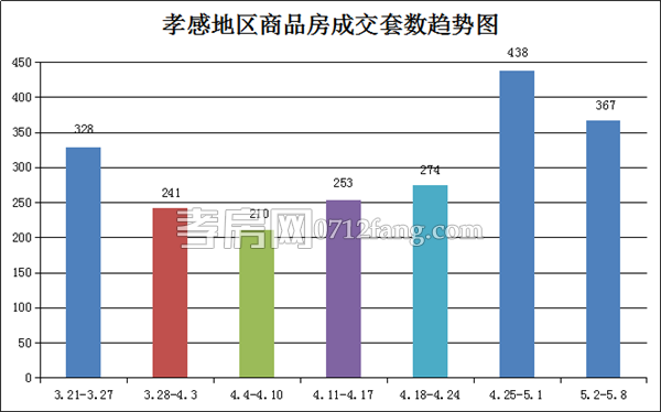 據(jù)孝房網(wǎng)數(shù)據(jù)研究統(tǒng)計,從2016年5月2日到2016年5月8日,孝感地區(qū)銷售總交易記錄367套,面積為43987.32平方米,金額為172027741.35元,均價為3910.85元/平方米。