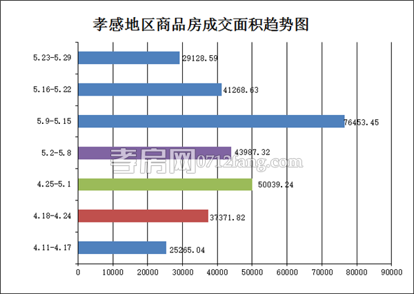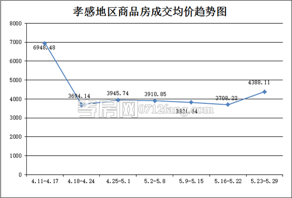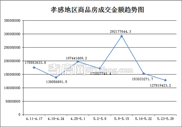 從2016年5月23日到2016年5月29日,孝感地區(qū)銷售總交易記錄251套,環(huán)比比上上周(337套)下降26%;成交均價4388.11元/平方米,環(huán)比上上周(3708.22元/平方米)上升18%;成交面積29128.59平方米,環(huán)比上上周(41268.63平方米)下降29%;成交總金額環(huán)比上上周下降16%。