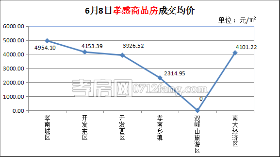 6月8日,全市的成交均價(jià)為3551.97元/㎡。其中孝南城區(qū)為4954.10元/㎡,開發(fā)東區(qū)為4153.39元/㎡,孝南鄉(xiāng)鎮(zhèn)為2314.95元/㎡,南大經(jīng)濟(jì)區(qū)為4101.22元/㎡。