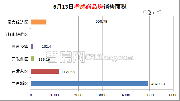 6月13日,全市的銷售面積7017.19㎡。其中孝南城區(qū)為4949.13m²,開發(fā)東區(qū)為1179.68㎡,孝南鄉(xiāng)鎮(zhèn)為102.40㎡,南大經(jīng)濟(jì)區(qū)為650.79㎡。