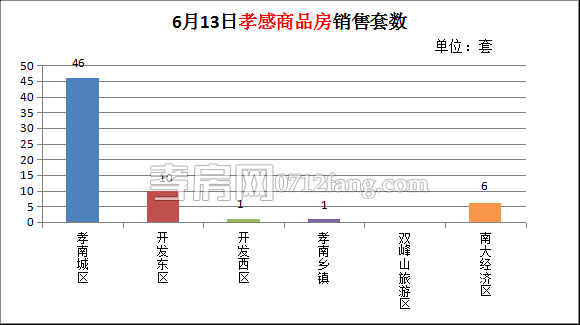 6月13日,全市的銷售套數(shù)為64套,其中孝南城區(qū)為46套,開發(fā)東區(qū)為10套,孝南鄉(xiāng)鎮(zhèn)為1套,南大經(jīng)濟(jì)區(qū)為6套。