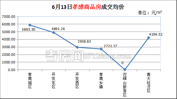 6月13日,全市的成交均價(jià)為5444.53元/㎡。其中孝南城區(qū)為5865.30元/㎡,開發(fā)東區(qū)為4891.26元/㎡,孝南鄉(xiāng)鎮(zhèn)為2721.17元/㎡,南大經(jīng)濟(jì)區(qū)為4196.52元/㎡。