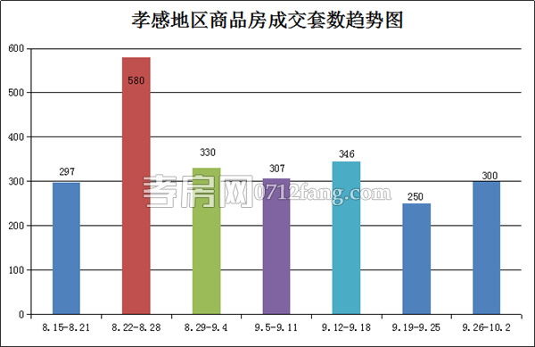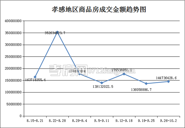 據(jù)孝房網(wǎng)數(shù)據(jù)研究顯示,從2016年9月26日到2016年10月2日,孝感地區(qū)銷售總交易記錄300套,面積為31147.74平方米,金額為144736428.63元,均價為4646.77元/平方米。