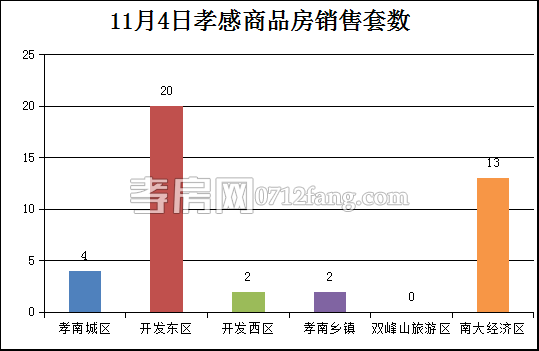 11月4日,全市的銷售套數(shù)為41套,孝南城區(qū)為4套,開發(fā)東區(qū)為20套,開發(fā)西區(qū)為2套,孝南鄉(xiāng)鎮(zhèn)為2套,南大經(jīng)濟(jì)區(qū)為13套。