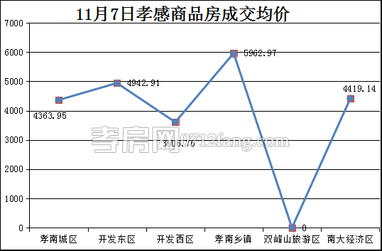 11月7日,全市的成交均價(jià)為4439.49元/㎡。其中孝南城區(qū)為4363.95元/㎡,開(kāi)發(fā)東區(qū)為4942.91元/㎡,開(kāi)發(fā)西區(qū)為3606.76元/㎡,孝南鄉(xiāng)鎮(zhèn)為5962.97元/㎡,南大經(jīng)濟(jì)區(qū)4419.14元/㎡。