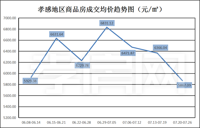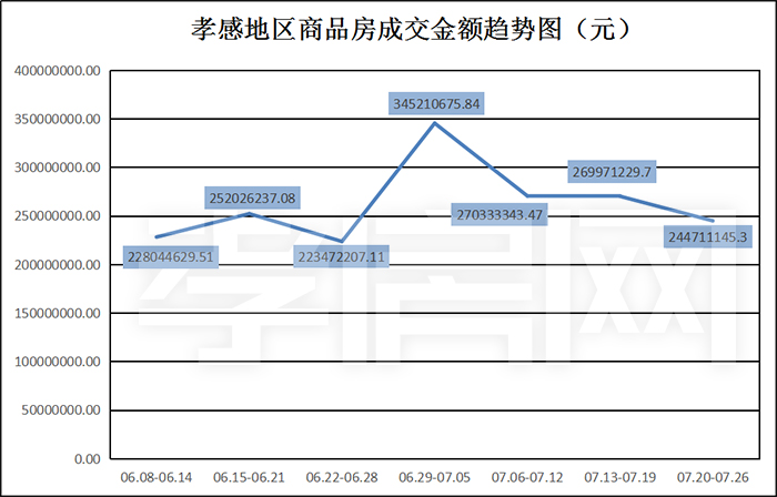 據(jù)孝房網(wǎng)數(shù)據(jù)研究顯示,從2020年07月20日到07月26日,孝感地區(qū)銷售總交易記錄346套,建面約41709.11平方米,金額為244711145.3元,均價為5867.09元/平方米。