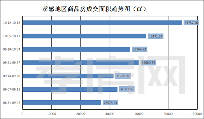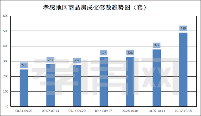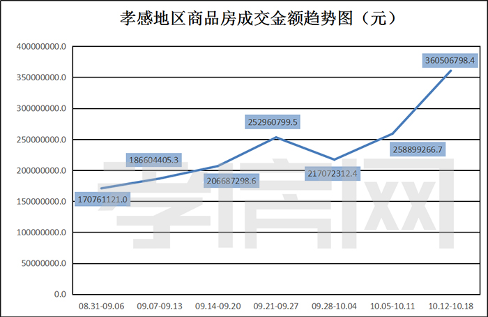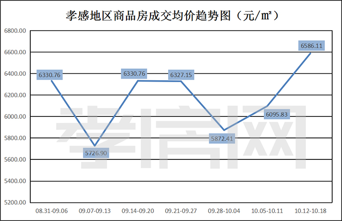 從2020年10月12日到10月18日,孝感地區(qū)銷售總交易記錄489套,環(huán)比上周(377套)上漲約29.71%;成交均價(jià)6586.11元/平方米,環(huán)比上周(6095.83元/平方米)上漲約8.04%;成交建面約54737.46平方米,環(huán)比上周(42471.54平方米)上漲約28.88%;成交總金額360506798.3元,環(huán)比上周(258899266.74元)上漲約39.25%。