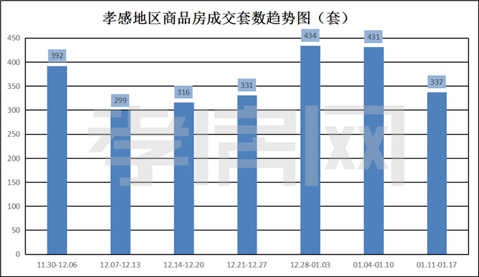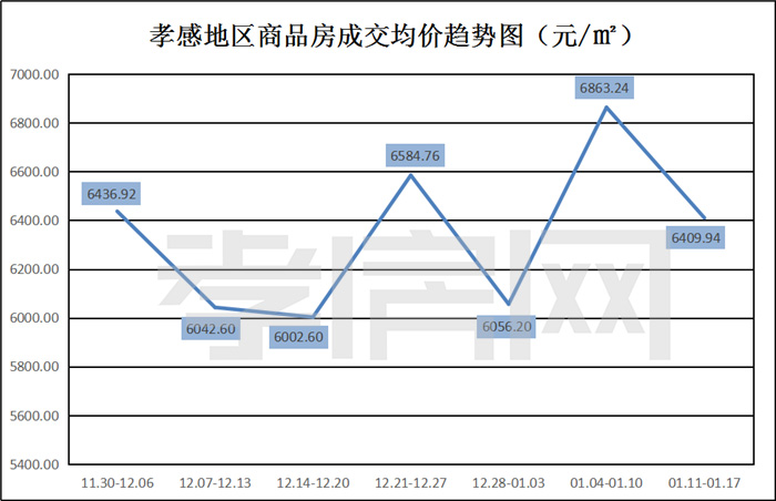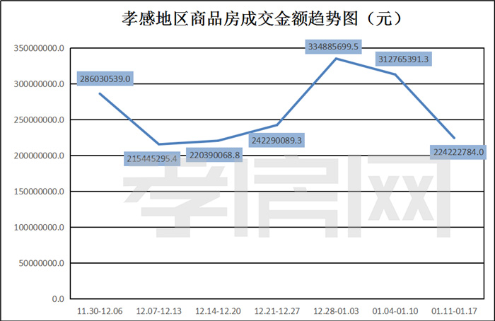 ? ? ? ?據(jù)孝房網(wǎng)數(shù)據(jù)研究顯示,從2021年1月11日到1月17日,孝感地區(qū)銷售總交易記錄337套,建面約34980.48平方米,金額為224222784.01元,均價(jià)為6409.94元/平方米。